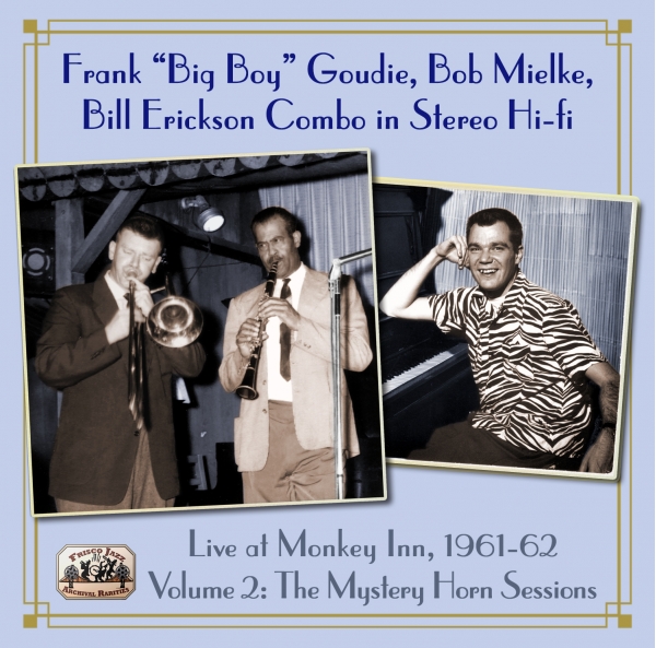 These four- and five-piece combos feature dynamic musicians of the Frisco jazz revival who jammed weekly in a Berkeley dive. At the peak of their musical powers were 6' 5" Louisiana-via Paris clarinet player Frank "Big Boy" Goudie, young trombonist Bob Mielke, then leading his own popular Bearcats jazz band, and piano player Bill Erickson, a brilliant but now forgotten talent who led combos and jam sessions.