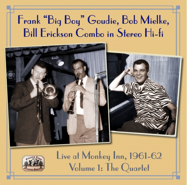This four-piece combo features dynamic musicians of the Frisco jazz revival who jammed weekly in a Berkeley dive. At the peak of their powers were 6’ 5” Louisiana-via Paris clarinet player Frank “Big Boy” Goudie, young trombonist Bob Mielke, then leading his own popular Bearcats jazz band, and piano player Bill Erickson, a brilliant but now forgotten talent who led combos and jam sessions on both sides of San Francisco Bay.